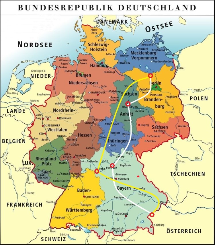 Ein farbenfroher Plan zeigt grob unsere Fahrt ab Ranshofen im unteren Inntal, die Stadt-Stationen Bamberg an der Regnitz und Magdeburg an der Elbe, das ländliche Ziel Hindenberg im Havel-Einzugsgebiet, retour dann via Würzburg am Main und die Rückfahrtskurve im Donautal über Passau: