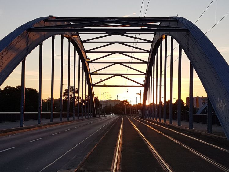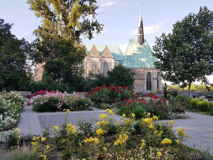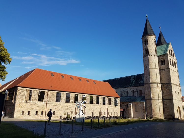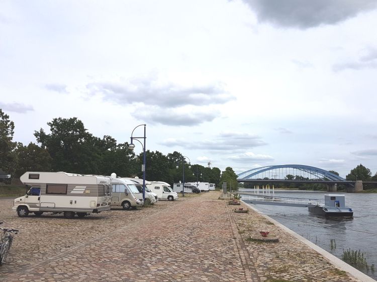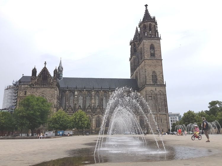 Tags darauf erreichen wir nach viel Strecke ein weites Tal und fahren dort in die Stadt Magdeburg ein. Direkt am Elbe-Ufer ist viel Platz für Wohnmobile. Reichlich stehen sie schon da und wir gesellen uns dazu. Nach etwas Pause lockt auch schon die wiederum nahe Altstadt.