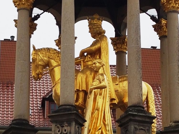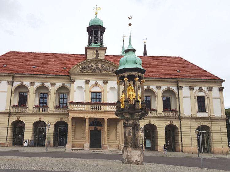 Zahlreiche Kirchen kommen gleich ins Blickfeld, aber wir fangen wieder mit den Pferden an. Hier machte einst im 17. Jh. ein gewisser Otto von Guericke zwischen zwei Gespannen seine Vakuum-Versuche mit den sogen. Magdeburger Halbkugeln. Zudem glänzt vor dem alten Rathaus ein Goldener Reiter. Ein paar Aufnahmen können wieder einen kurzen Eindruck von der Stadt vermitteln: