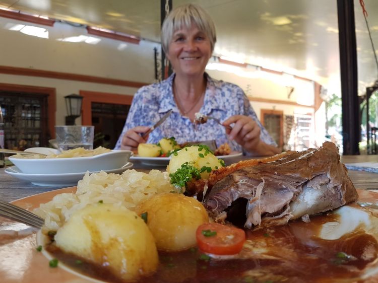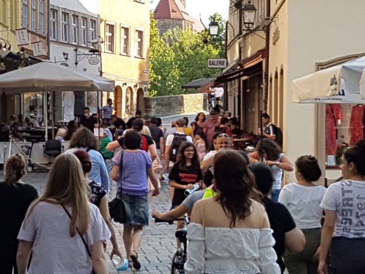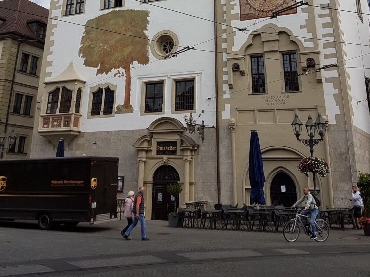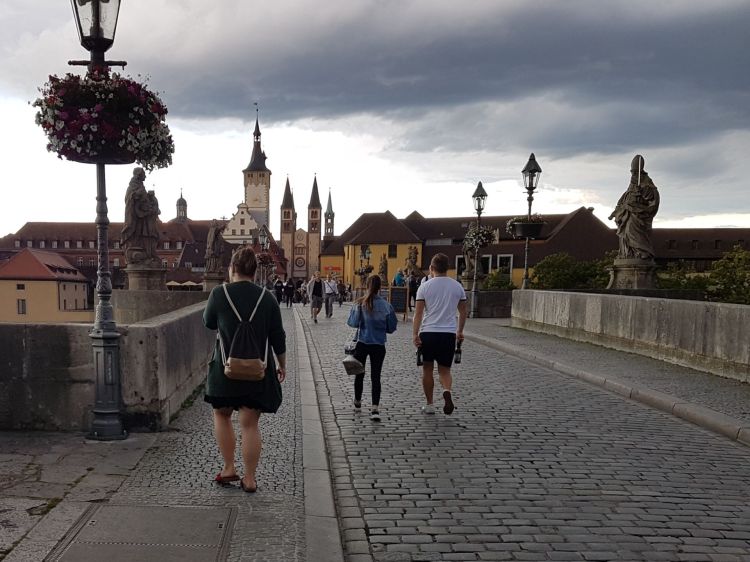 Zum Tagesausklang machen wir noch einen gewitterstürmischen Spaziergang über die alte Mainbrücke und müssen gleich dahinter wegen Regen in den Ratskeller flüchten. Es sollte einem nichts Schlimmeres passieren: vorweg aber Maske ins Gesicht und Kontaktdaten in das Corona-Stammbuch, erst dann gibt’s kühles Bier und (wir sind ja in Deutschland) leckere Speisen – diesmal regionale Bockwurst mit Sauerkraut und Kartoffelschaum.