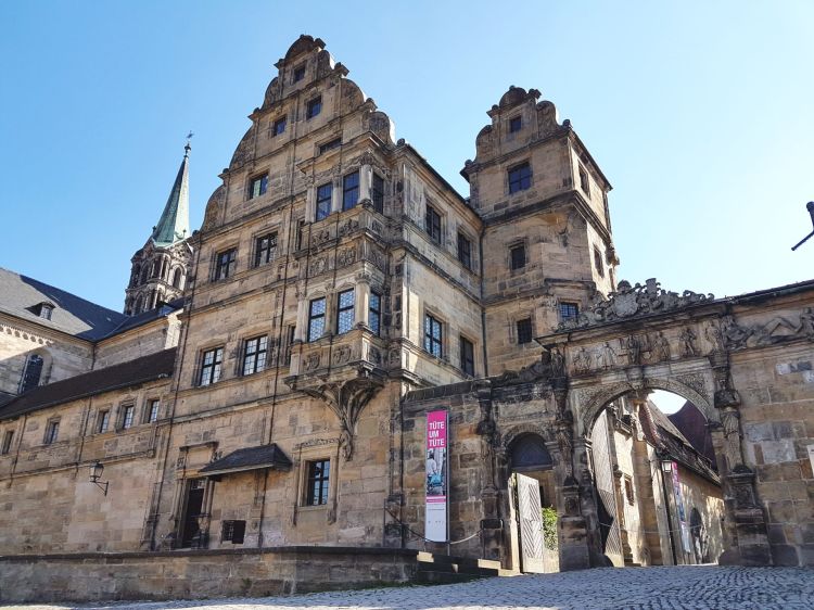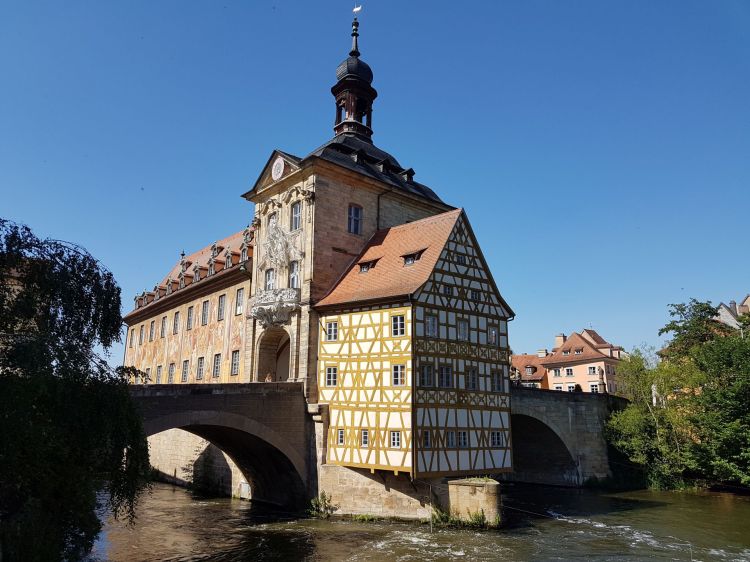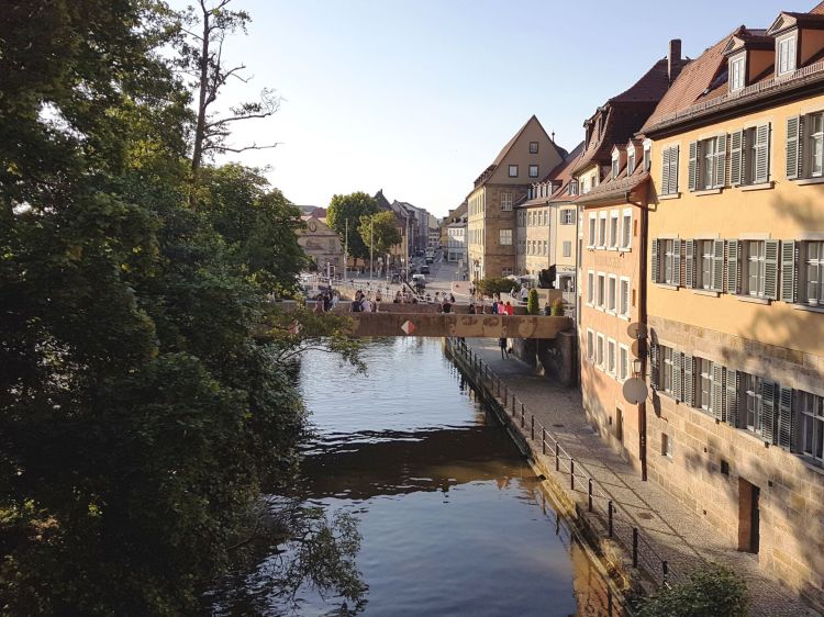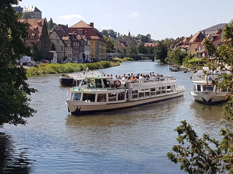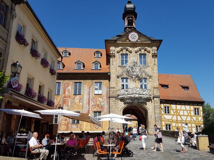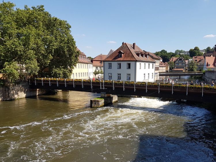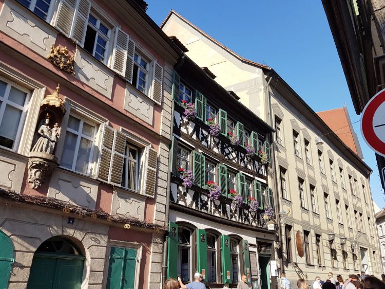 Der Wohnmobil-Standplatz neben dem Main-Donau-Kanal ist voll, also kreisen wir ein paar Runden und finden dann nahe dem Bistumhaus St. Otto eine Seitenstraßen-Parklücke. Auf Schusters Rappen (sind das auch Pferde?) sind wir bald in der Altstadt an der Regnitz. Ab hier dürfen ein paar Bilder für Bamberg sprechen: