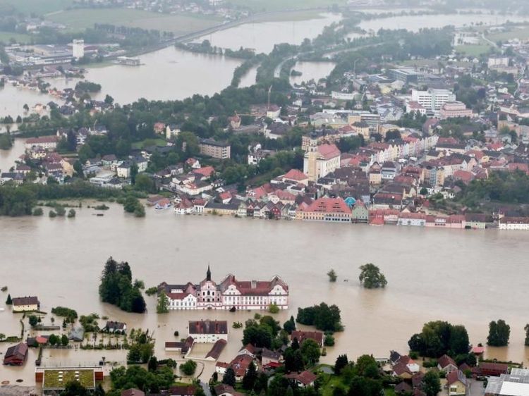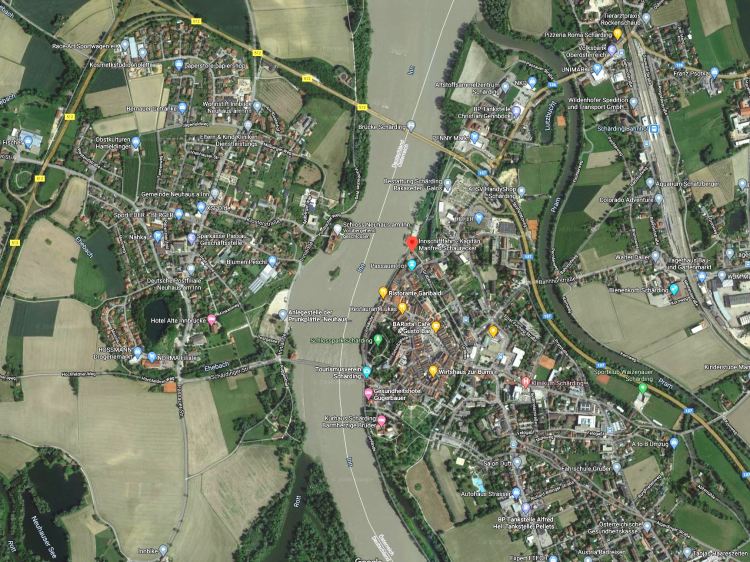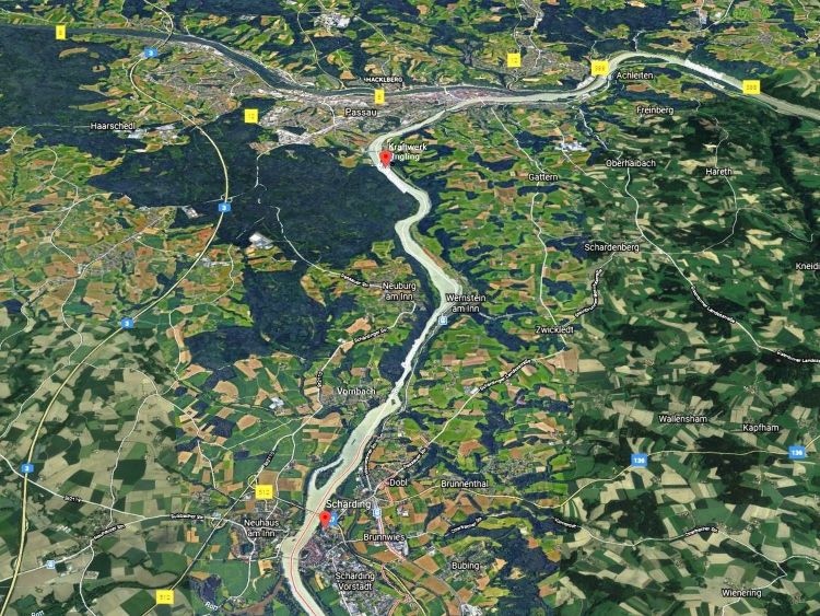 Das mit dem oben erwähnten Pegelstand ist nicht ganz unwichtig. Was der Inn mit der Umgebung von Schärding und Neuhaus anstellen kann, weil die Wassermassen bei Hochwasser nicht schnell genug durch die Enge zwischen Vornbach und Wernstein hindurch können, das zeigt ein Bild aus 2013:
